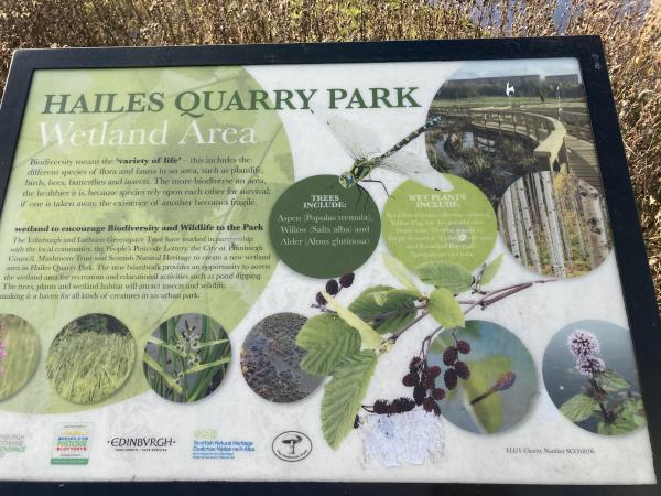 Hailes Quarry Park is managed by the City of Edinburgh Council. It lies on the north side of the Union Canal and slopes down to the north. Much of the park is rough open, with a network of grassy and tarmac paths. There are areas of shrubby woodland and a wetland with a boardwalk, as well as a play area. The map also covers the neighbouring residential development at the SE corner.